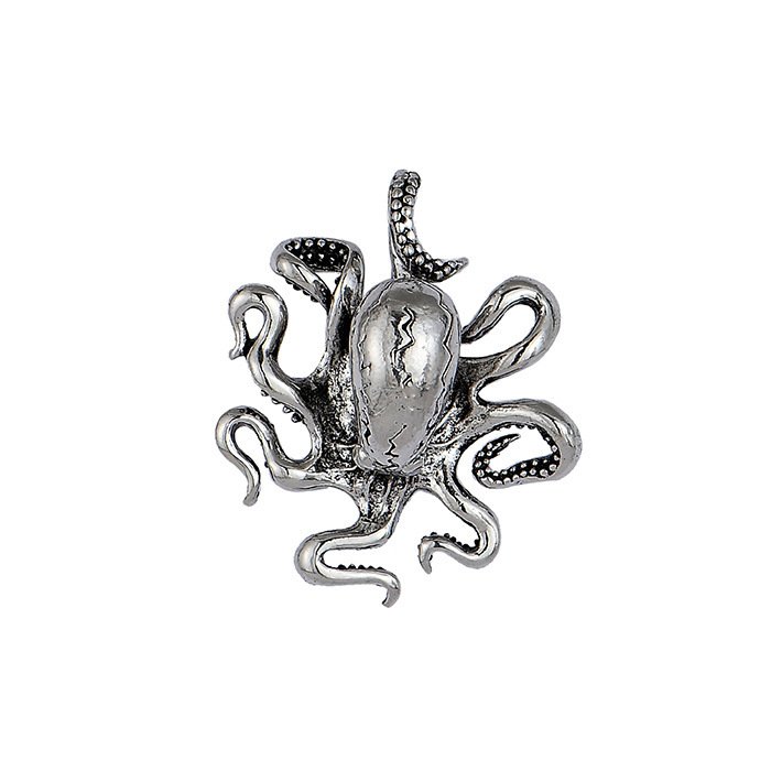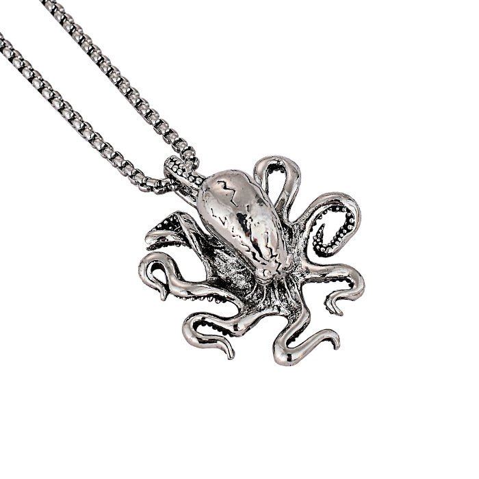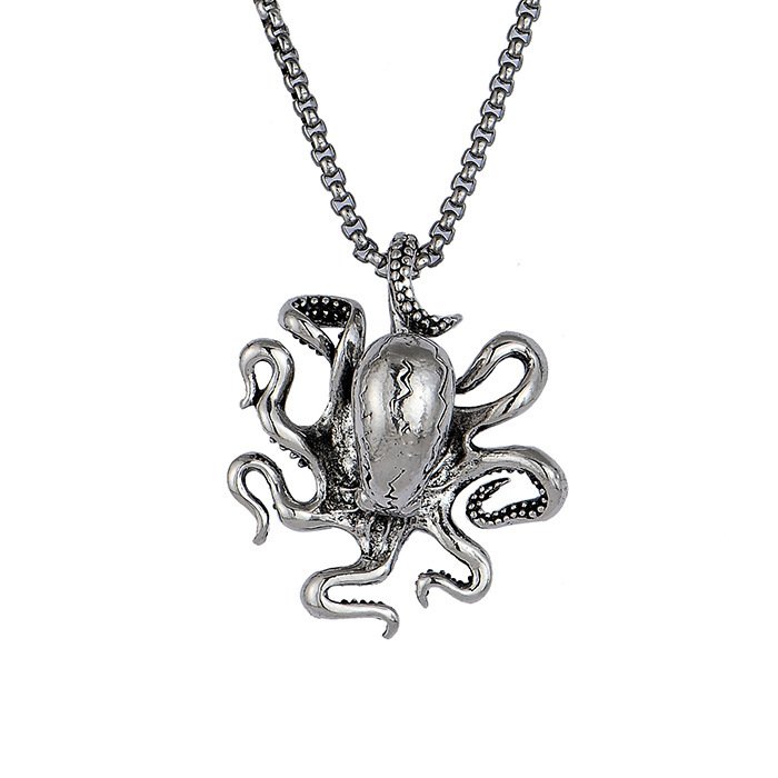 A cast alloy octopus pendant suspended from a square link chain. Structured marine symbolism with dimensional presence and balanced proportion.